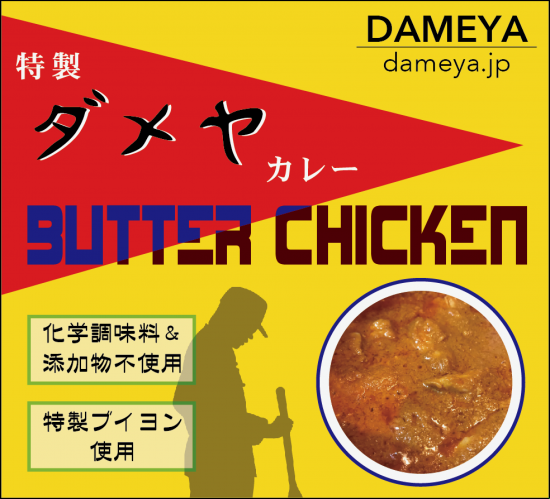 ダメヤ店主がレトルト製品用に幾度となく調整したレシピと、嘘のない素材のみで味を重ねあげた上級バターチキンです。