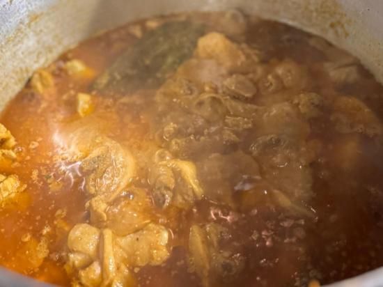 鶏肉煮込み料理。骨付き鶏肉をヨーグルトと自家配合スパイスをベースとして、じっくりと煮込みました。