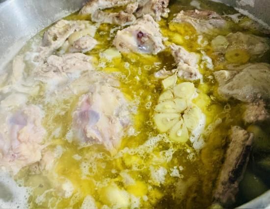 スープ材料は鶏ガラ、鶏くるぶし、しょうが、にんにく、昆布のみのしょうが香る醤油ラーメン。